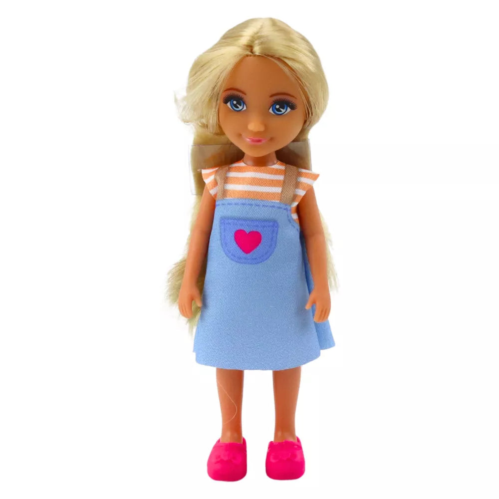 Lėlės stilius: suknelė su petnešomis, rožiniai bateliai, šviesūs plaukai