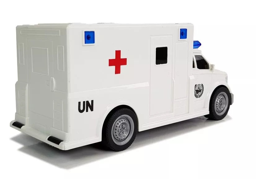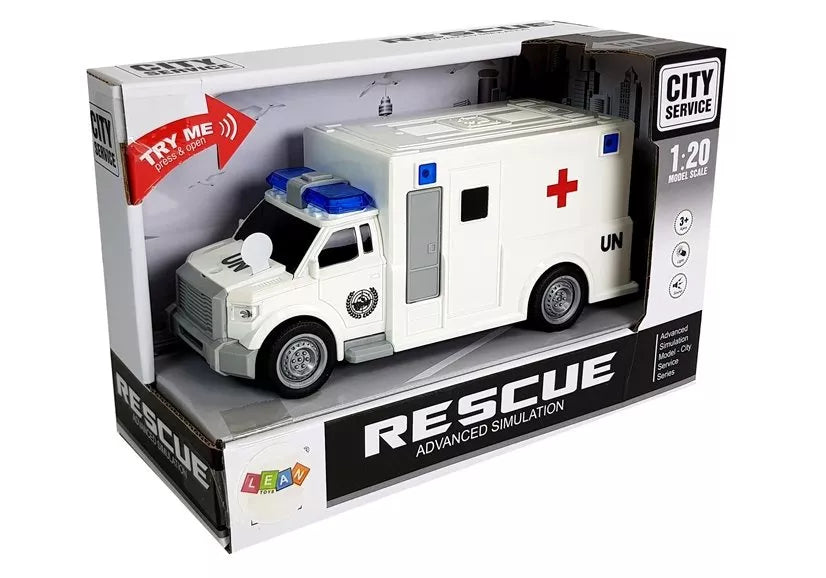 Baltas greitosios pagalbos automobilis su garso ir šviesos efektais