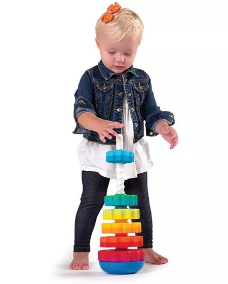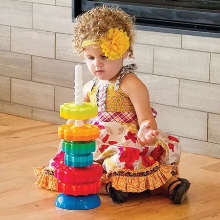 Šis žaislas apgalvotas iki smulkmenų. Pagrindas yra dvipusis: viena pusė stabili, o kita – siūbuojanti, suteikianti papildomą iššūkį vaiko koordinacijai. Šeši ryškūs, dvipusiai žiedai yra skirtingų formų (gėlytės, žvaigždės) ir malonūs liesti. O smagiausia dalis laukia pabaigoje – ištraukus ašį, visi žiedai vienu metu smagiai nusisuka nuo apačios, kviesdami pradėti žaidimą iš naujo. Tai žaislas, kuris sujungia statymą, sukimąsi ir begalinį džiaugsmą.