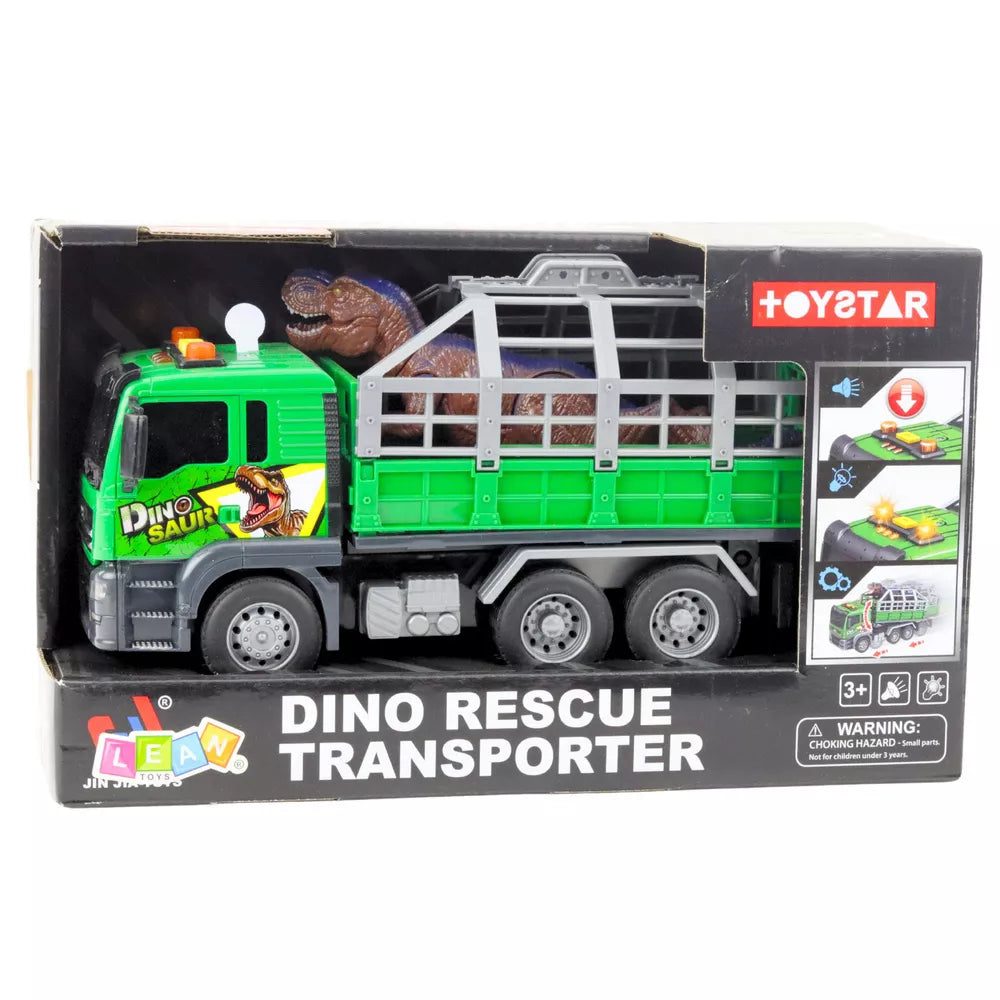 Dinozaurų transporatvimo sunkvežimis su rudu dinozauru