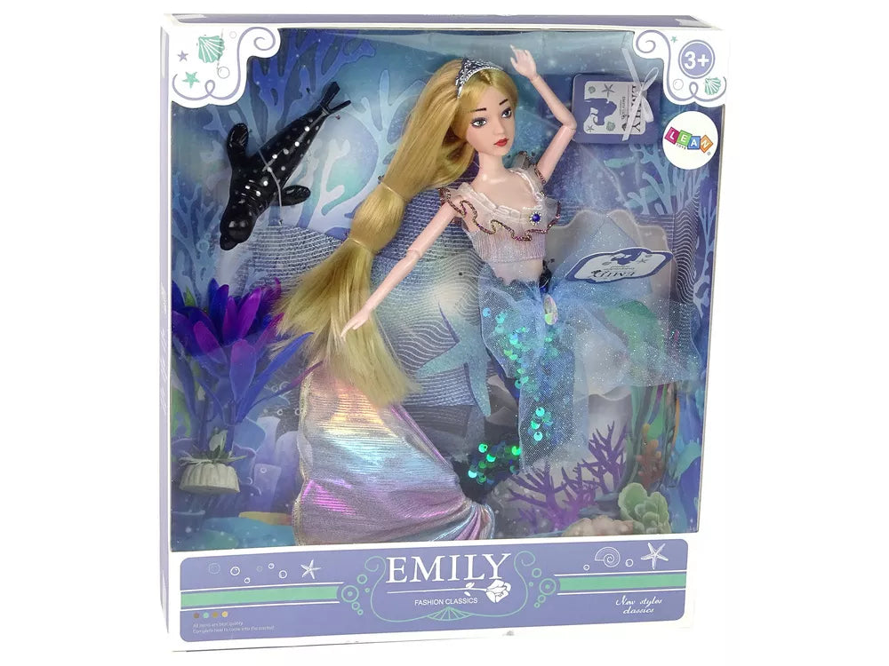 Pasisveikinkite su undinėlės lėle Emily, kuri kviečia jus į magišką povandeninių nuotykių pasaulį! Ši žavi lėlė turi ilgus šviesius plaukus ir žalias akis, o spindinti diadema ant galvos pabrėžia jos unikalumą. Jos uodega – žėrintys žali ir violetiniai blizgučiai – suteikia žavesio, o ją galima nušluostyti, kad ji taptų juoda, sukuriant žavų efektą. Staigmenos tuo nesibaigia – uodega taip pat nuimama, todėl su lėle galima žaisti kaip su įprasta lėle, stovint ant kojų.