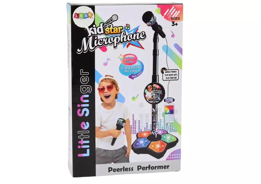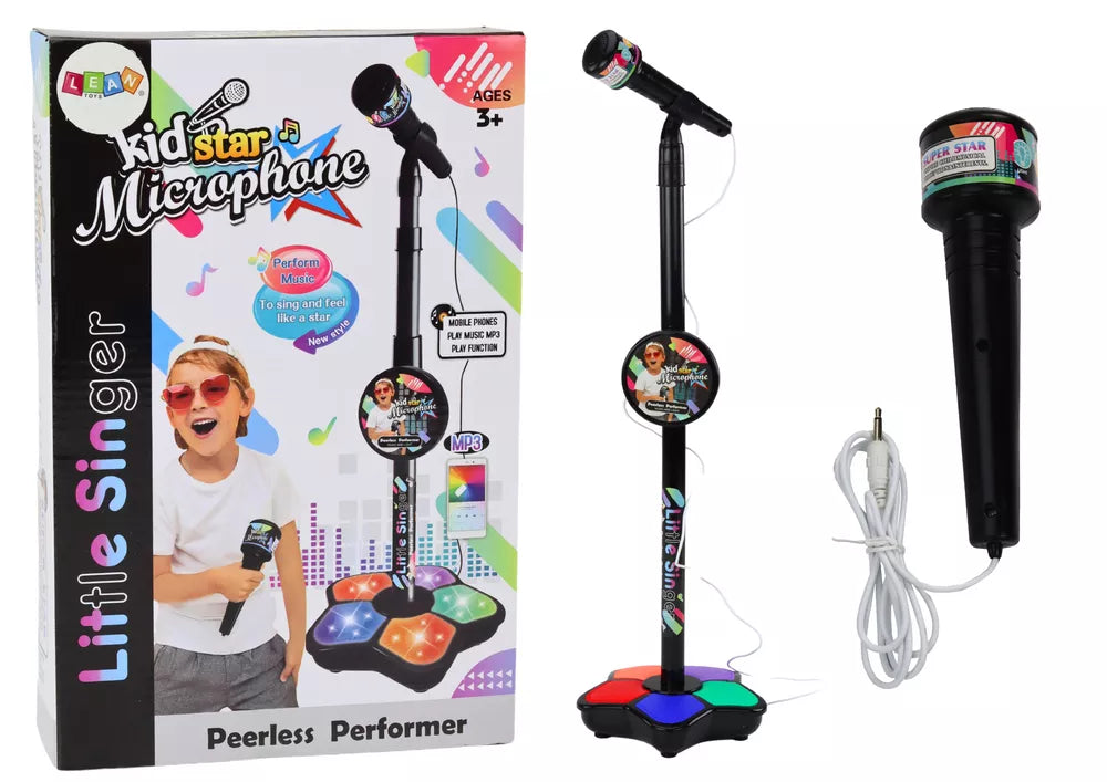 Be to, mūsų mikrofonas yra su reguliuojamu stovu, leidžiančiu pritaikyti mikrofono aukštį vaiko ūgiui, užtikrinantį patogumą ir komfortą dainavimo metu.