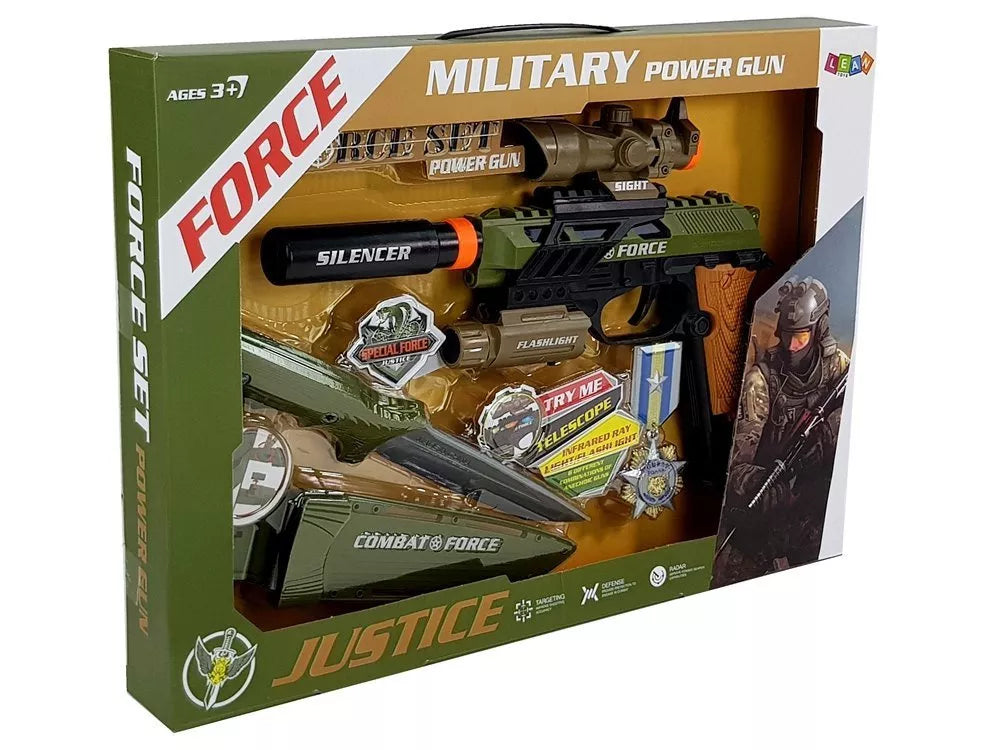 Visi elementai pagaminti iš aukštos kokybės medžiagų, kas užtikrina, kad jie tarnaus vaikui ilgą laiką. Viso rinkinys išlaikytas tamsiai žaliame atspalvyje. Pistoletas paspaudus gaiduką skleidžia šūvio garsą, užtaisymo garsą ir krentančio šovinuko garsą. Užsidėjus garso slopintuvą, garsas bus visai kitoks. Šių veiksmų metu galima pastebėti papildomus šviesos efektus ant ginklo. Nei vienas priešininkas nepabėgs! Mažojo vaizduotė tikrai praturtės. Norint padidinti tikslumą ir preciziją, pistolete sumontuotas taikiklis, kuris tikslins šūvį. Žibintuvėlis papildomai apšvies patalpą. Ilgas gumos peilis taip pat bus būtinas mūšyje.