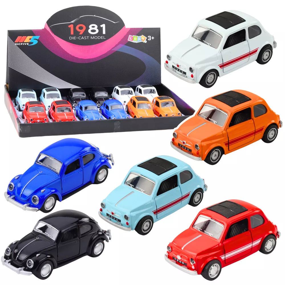 Mastelis: 1:36Matmenys: 11,5 x 5 x 4,5 cmPakuotės matmenys: 40,5 x 30,5 x 5,5 cm. Medžiaga: metalas su plastikiniais elementais Funkcijos: pavaros mechanizmas, atidaromos durys Modelis: klasikinis keleivinis automobilis Spalvos: įvairių spalvų mišinys (siunčiama atsitiktine tvarka) Paskirtis: žaislas, kolekcinis modelisRINKINIO SUDEDAMOSIOS DALYS: