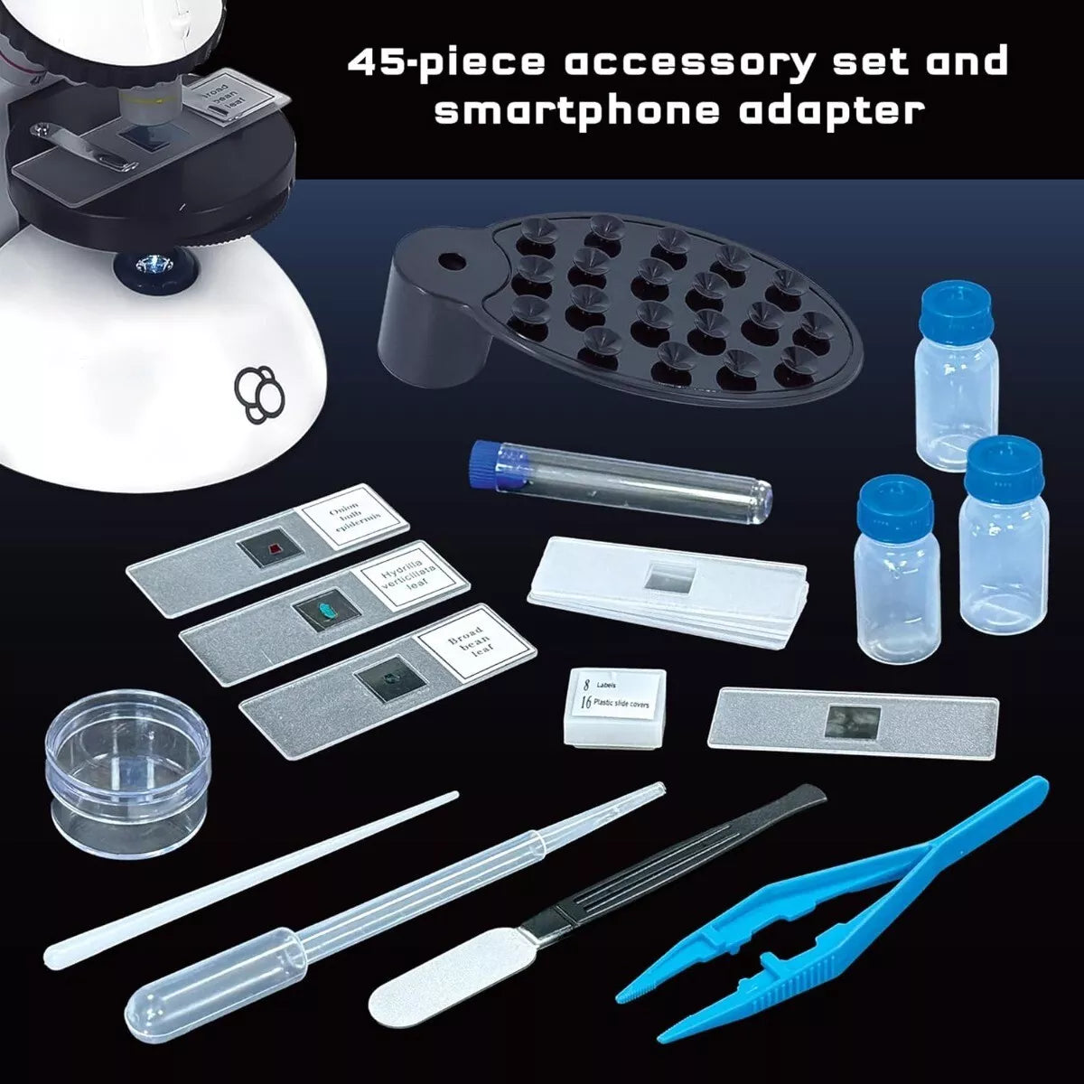 Pradėkite savo kelionę mokydamiesi naudotis mikroskopu ir tyrinėdami tris jau paruoštus pavyzdžius stikleliuose. Vėliau, pasitelkę gausų 45 priedų rinkinį, išmokite patys rinkti ir paruošti savo pavyzdžius stebėjimui po mikroskopu. Mikroskopas pasižymi galingu didinimu iki 600 kartų (60x, 150x, 600x) , kurį užtikrina 15x okuliaras ir trys objektyvo lęšiai. Jūsų pavyzdžius ryškiai apšvies baterijomis maitinama LED lemputė.