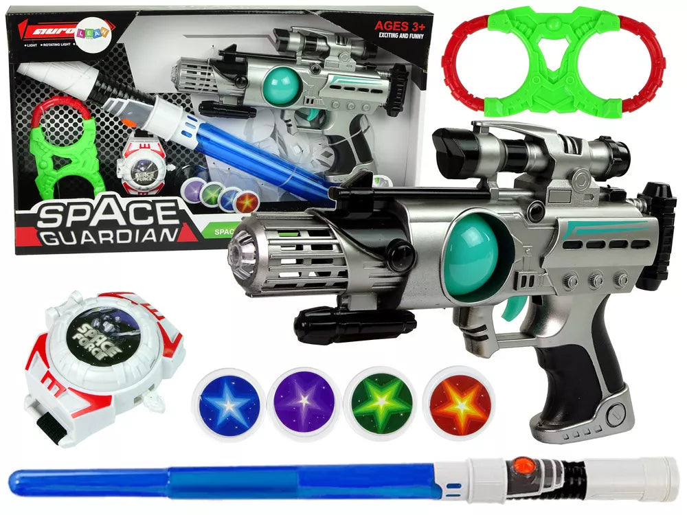 Pristatome nuostabų kosminių ginklų rinkinį, kuris yra puikus atramos įrankis kovojant su pavojingu priešu iš tolimos planetos. Šis unikalus, originalus ginklas turi kosminius garsus ir šviesas, kurie tikrai paskatins visus vaikus žaisti. Kosmoso karas susideda iš daugybės elementų. Rinkinio spalvų schema yra tokia: balta, juoda, raudona, žalia. Paspaudus gaiduką, ginklas užsidega ir skleidžia garsus, todėl verta žaislą išbandyti tamsioje patalpoje. Papildomas rankinių ginklų elementas padės jums pagauti priešą. Disko metimo įrenginys gali būti nešiojamas rankoje, o jūs galite į jį įdėti pateiktus diskus ir šauti į priešą.