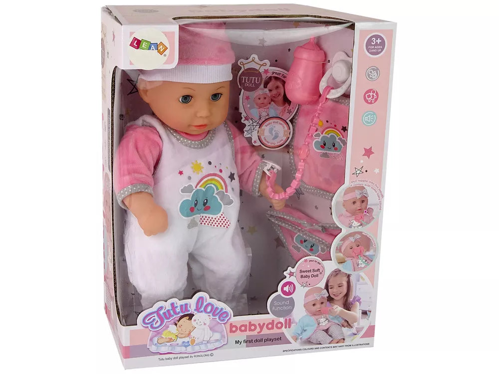 Žavinga kūdikių lėlė yra puikus pasirinkimas kiekvienam vaikui, kuris mėgsta rūpintis savo žaislais. Žaidimas su lėle lavina empatiją, atsakomybės jausmą ir leidžia įsijausti į globėjo vaidmenį. Vaikas, imituodamas suaugusiuosius, mokosi rūpintis ir kuria savo artumo ir meilės jausmą. Lėlė apsirengusi rausvos ir baltos spalvos pižama su mielu šypsančiu debesėliu, o galvą puošia suderinta kepuraitė. Rinkinyje yra čiulptukas, buteliukas, seilinukas ir kelnaitės, todėl žaidimas yra dar realistiškesnis. Visi elementai puikiai dera tarpusavyje, sukurdami harmoningą ir mielą stilių. Lėlė turi judančias rankytes, kojytes ir galvytę, todėl ją galima pastatyti įvairiose pozicijose – galima pasodinti arba paguldyti. Nuimami drabužiai suteikia galimybę keisti garderobą ir dar labiau įsitraukti į žaidimą. Realistinės funkcijos, tokios kaip judantys vokai ir čiulptuko bei miego garsai, daro kūdikį panašų į tikrą kūdikį. Įkišus buteliuką į lėlytės burną, galima išgirsti būdingą čiulpimo garsą. Lėlė pagaminta iš aukštos kokybės kietos gumos, todėl yra ilgaamžė ir saugi naudoti. Tai žaislas, kuris tarnaus ilgus metus.