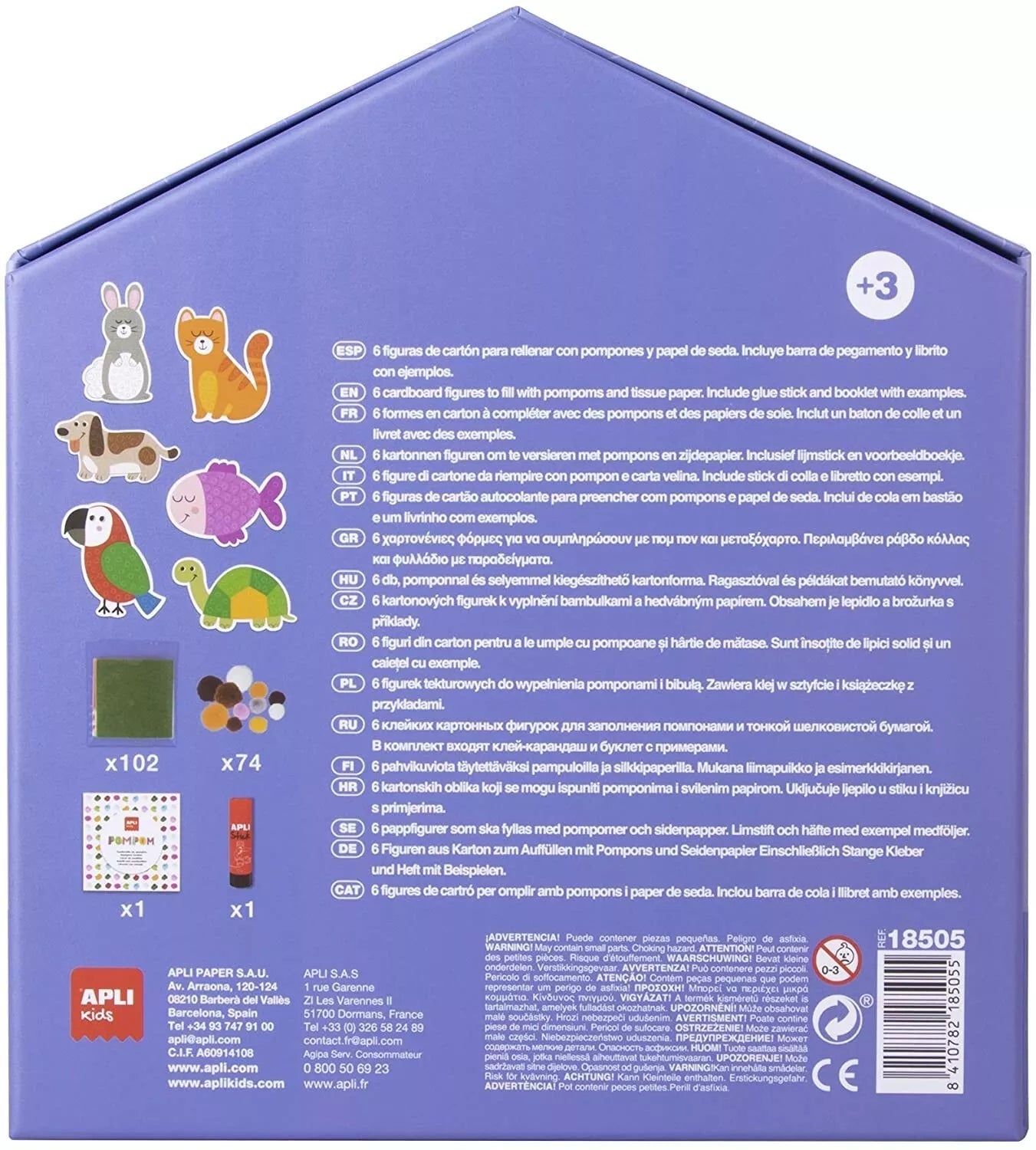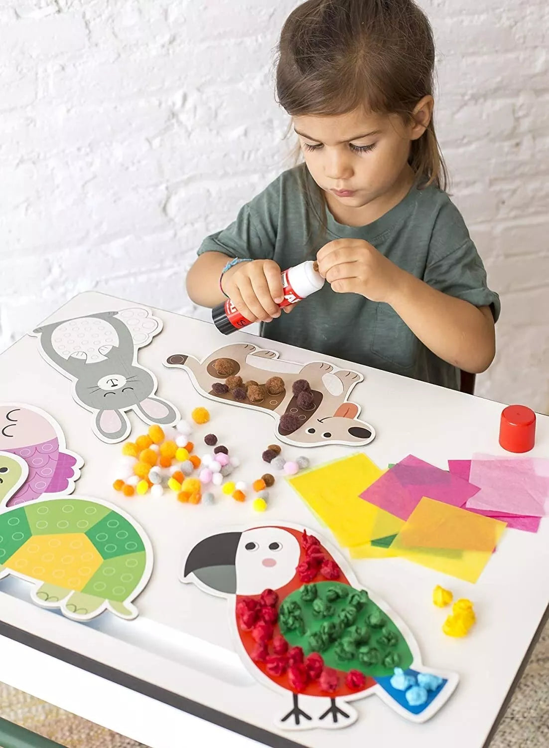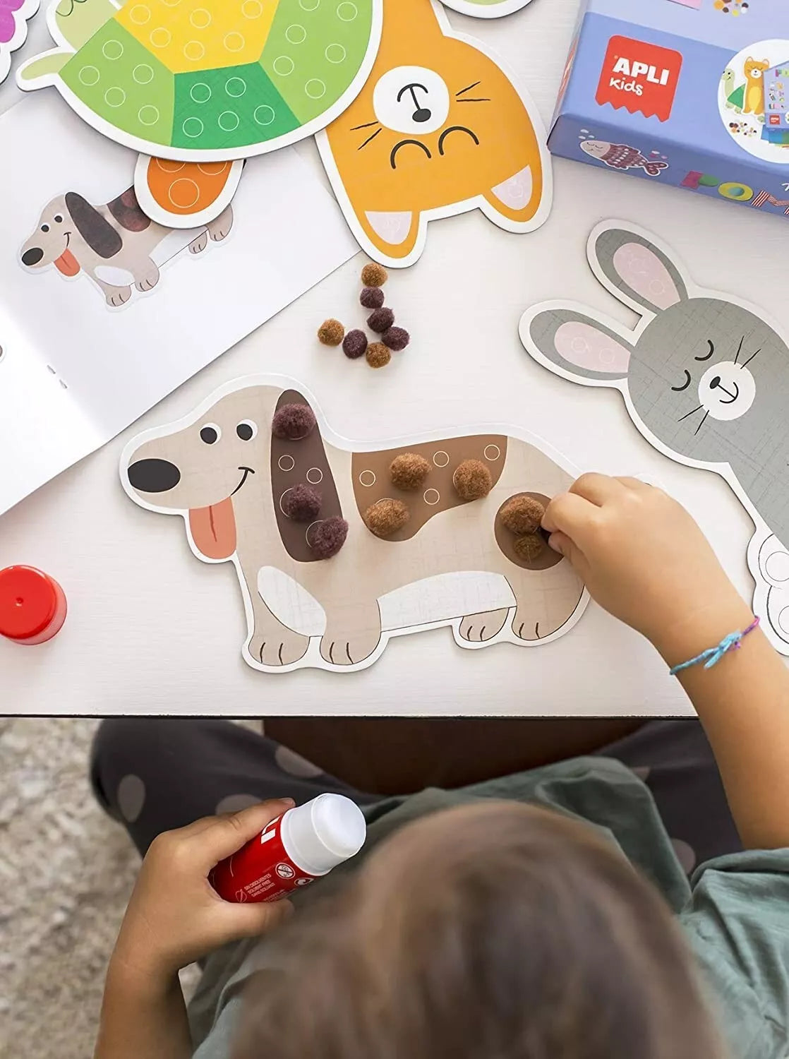 Rinkinyje rasite net 6 didelius (XL dydžio) gyvūnų trafaretu (šuniuką, kačiuką ir kt.), specialiai pritaikytus mažiems vaikams. Veikla yra dvejopa: vaikai klijuoja jau paruoštus minkštus pomponus nurodytose vietose, o kitas vietas užpildo patys formuodami rutuliukus iš šilkinio popieriaus. Tai ne tik sukuria gražų 3D efektą, bet ir yra neįkainojama mankšta pirštukams. Rinkinyje yra viskas, ko reikia: klijai, popierius, pomponai ir instrukcija.