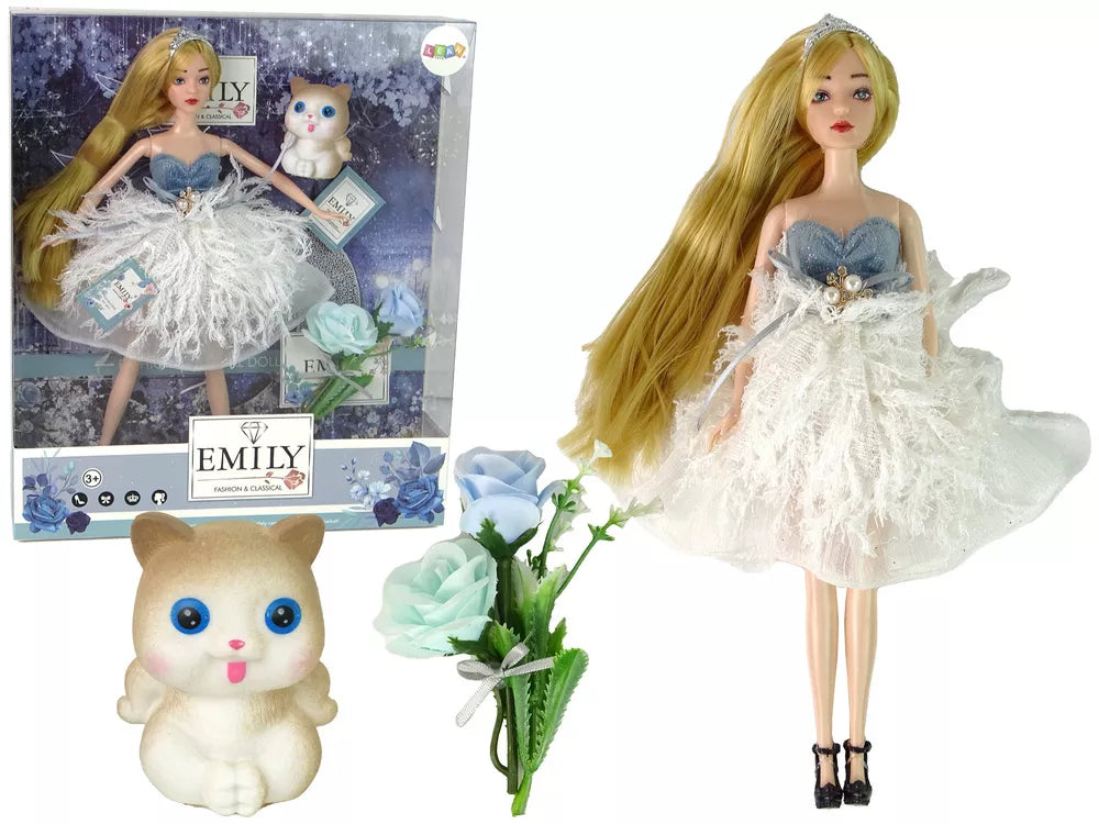 Pristatome žavią lėlę Emily su ilgais, šviesiais plaukais, apsirengusią elegantiška suknele, puošta blizgučiais ir plunksnas primenančiu audiniu. Jos plaukus puošia tiara, o mėlynos akys prideda žavesio. Emily avi gražius, juodus aukštakulnius batus, papuoštus rože.
