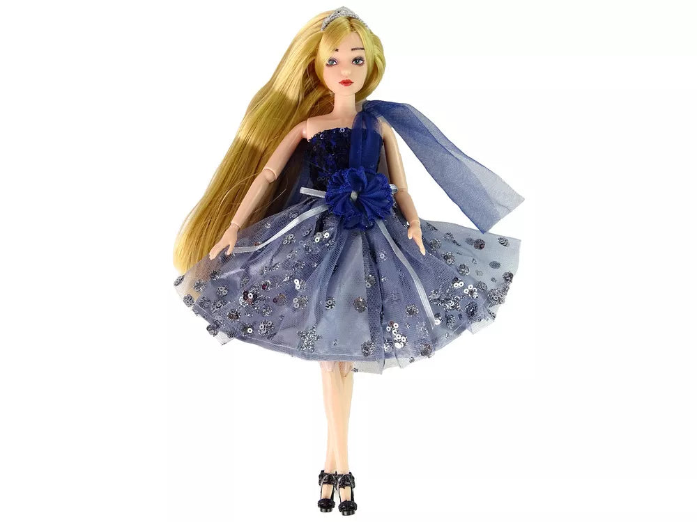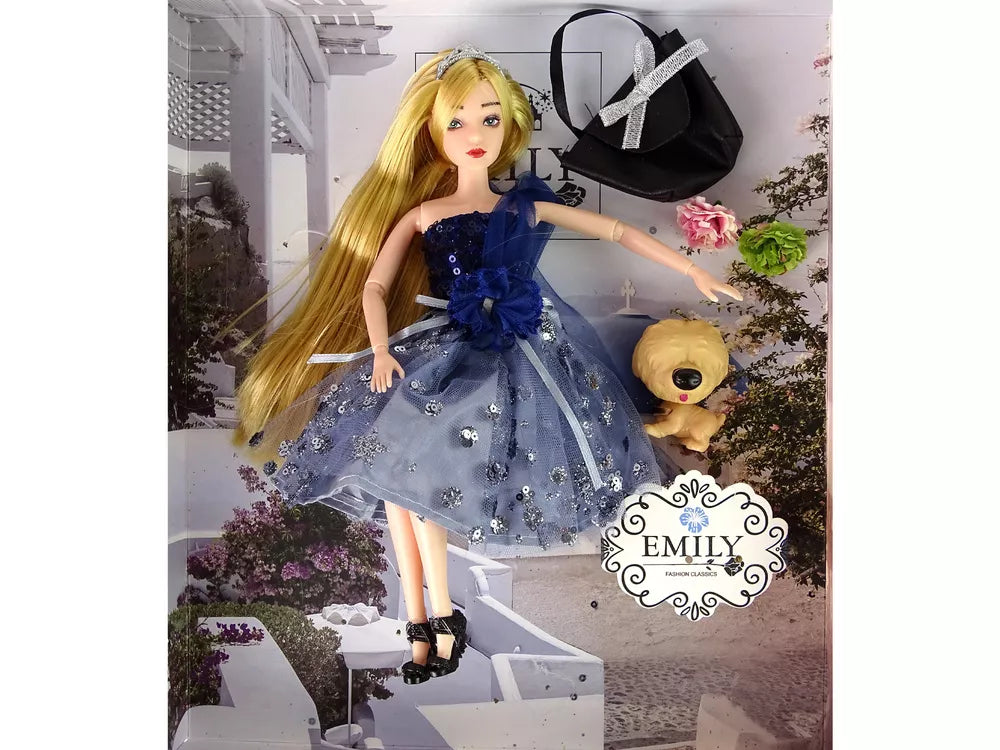 Pristatome žavingą lėlę Emily su įspūdinga mėlyna suknele, dekoruota blizgančiais blizgučiais ir elegantišku kaspinu. Jos ilgi šviesūs plaukai puikiai papuošti tiara, suteikiančia ypatingo žavesio. Ant kojų Emily dėvi stilingus juodus aukštakulnius, papuoštus subtilia rože.