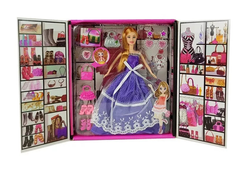 Ši žaislinė lėlė turi storus, ilgus, šviesius plaukus ir mergaitišką veidą, papuoštą lengvu makiažu. Ji atrodo kaip princesė! Ji vilki ilgą violetinę balių suknelę su baltais nėriniais. Kupina elegancijos ir aksesuarų, ji pasiruošusi dalyvauti prabangiame baliuje ir sužavėti visus aplinkinius. Rinkinyje yra įspūdingų aksesuarų, kuriuos galite pridėti pagal savo skonį. Dėžutė atsidaro kaip drabužių spinta, o viduje eksponuojami paveikslėliai, imituojantys drabužių spintą. Vaikai čia gali lengvai laikyti lėlę ir jos aksesuarus.