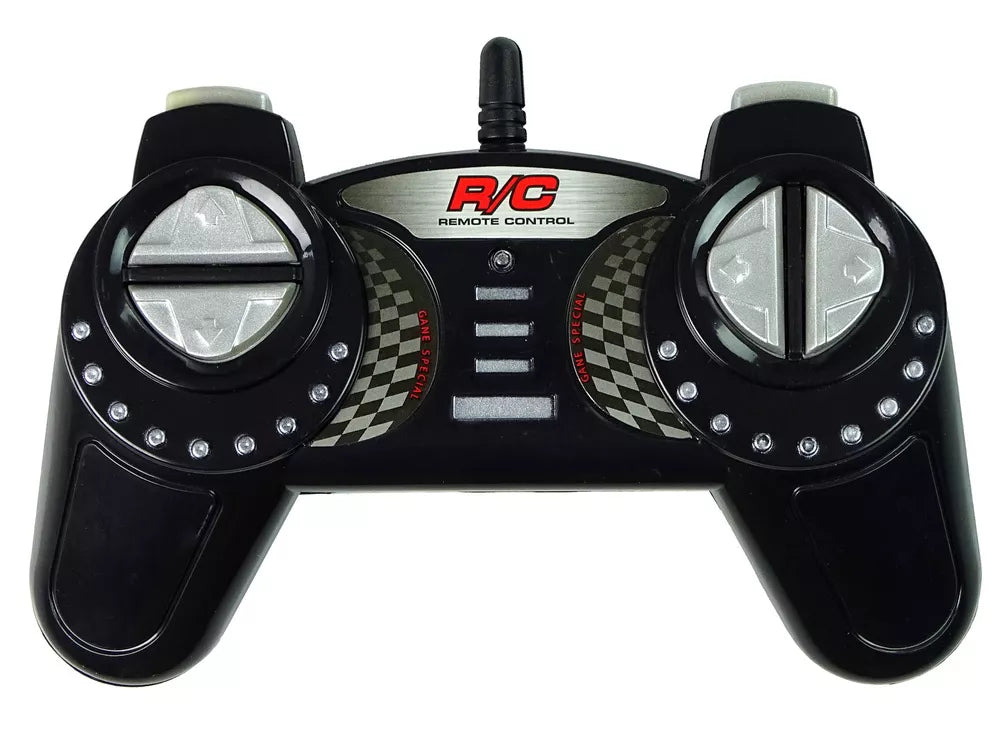 Rinkinyje esantis nuotolinio valdymo pultelis priima 2,4G dažniu, todėl žaidžiant sumažėja bet kokių trukdžių. Nuotolinio valdymo pulto atstumas yra 10-15 m. Jame yra du vairalazdės, atsakingos už valdymą pirmyn-atgal ir į dešinę-kairę. Balta spalva su juodos ir geltonos spalvos elementais leidžia transporto priemonei išsiskirti iš kitų, be to, šviečiantys priekiniai ir galiniai žibintai suteikia tikroviškumo, todėl jausitės taip, lyg vairuotumėte tikrą sportinį automobilį.