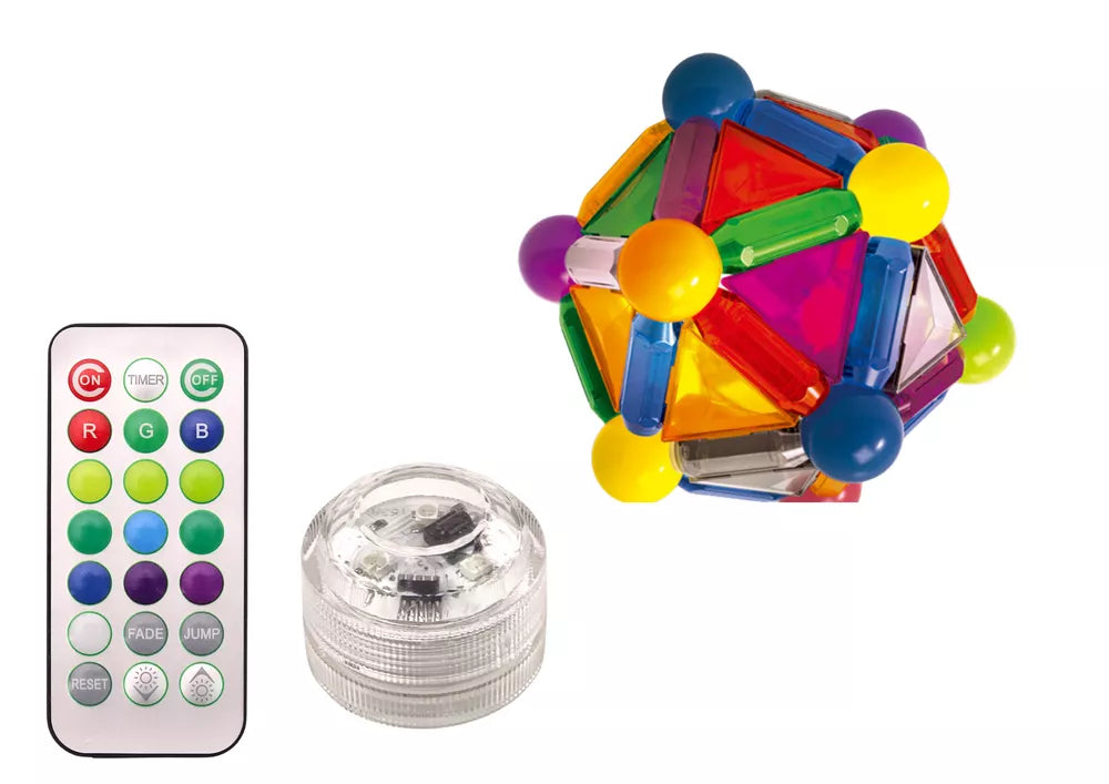 Be to, rinkinyje taip pat yra šviesa konstrukcijoms apšviesti, kurią galima valdyti pridėtu nuotolinio valdymo pulteliu. Taip vaikai gali keisti apšvietimo spalvas, o tai dar labiau praturtina ir paįvairina jų žaidimą, skatina toliau tyrinėti ir kurti.