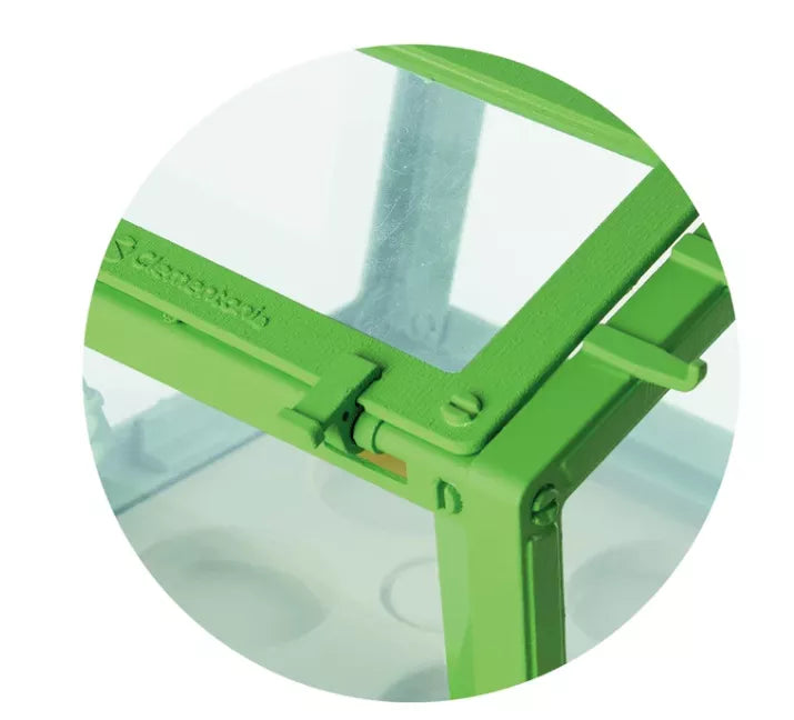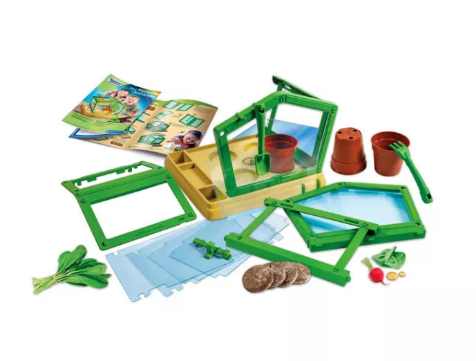 Rinkinį sudaro permatomas šiltnamis su reguliuojamu stogu, sėklos, durpės ir sodo įrankis – viskas, ko reikia norint pradėti žaisti ir mokytis iš karto.