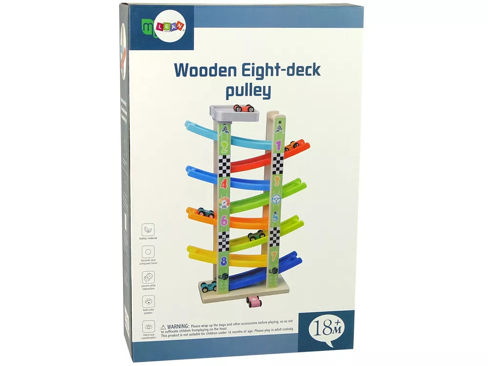 Įvairiaspalvis kalnelis turi 8 aukštus, kurių kiekvienas sunumeruotas. Vienu metu važiuokite keliais automobiliais ir lenktyniaukite! Mažylis išmoks, kaip automobiliai juda nuožulniais paviršiais.