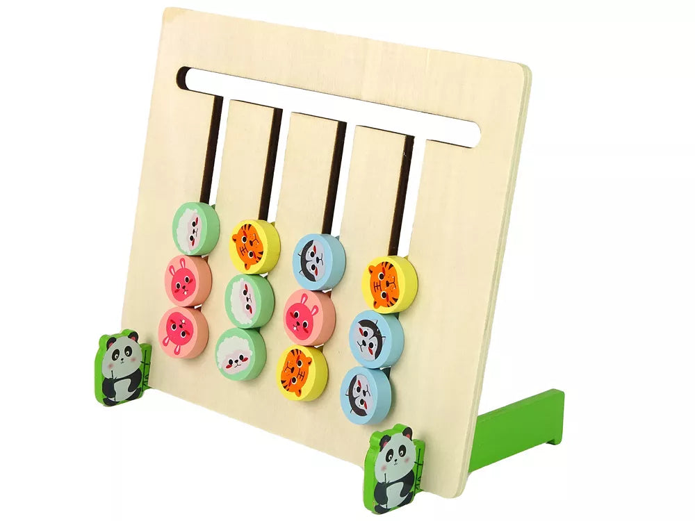 Dėlionė turi dviejų pusių žaidimo lentą, vienoje pusėje yra keturių spalvų apskritimai, o kitoje - keturi gyvūnai: triušis, tigras, šuo ir avis. Du stovai su pandos atvaizdu išlaikys lentą vertikaliai. Žaidėjo užduotis - sudėlioti figūrėles ant lentos taip, kaip nurodyta ištrauktoje kortelėje su užduotimi.
