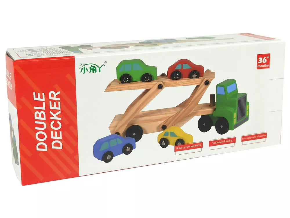 Dviejų aukštų priekaba su automobiliais pagaminta iš medžio. Šio rinkinio neturėtų trūkti nė vieno mažojo automobilių mylėtojo kolekcijoje. Rinkinį sudaro: sunkvežimis, dviaukštė priekaba ir 4 automobiliai. Priekabą galima išlankstyti, kad automobiliai galėtų lengvai į ją įvažiuoti. Ryškios spalvos traukia akį.