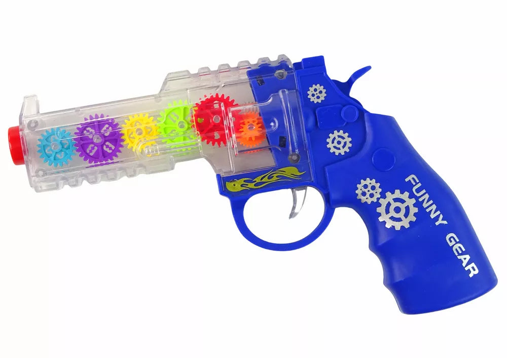 Jis veikia su dviem AA baterijomis. Paspaudus mygtuką, žaislas šviečia spalvingomis šviesomis ir skleidžia įvairius garsus, kurie suteikia autentiškumo. Be to, spalvingi sukasi viduje ginklo, sukurdami nepaprastą vizualinį efektą.