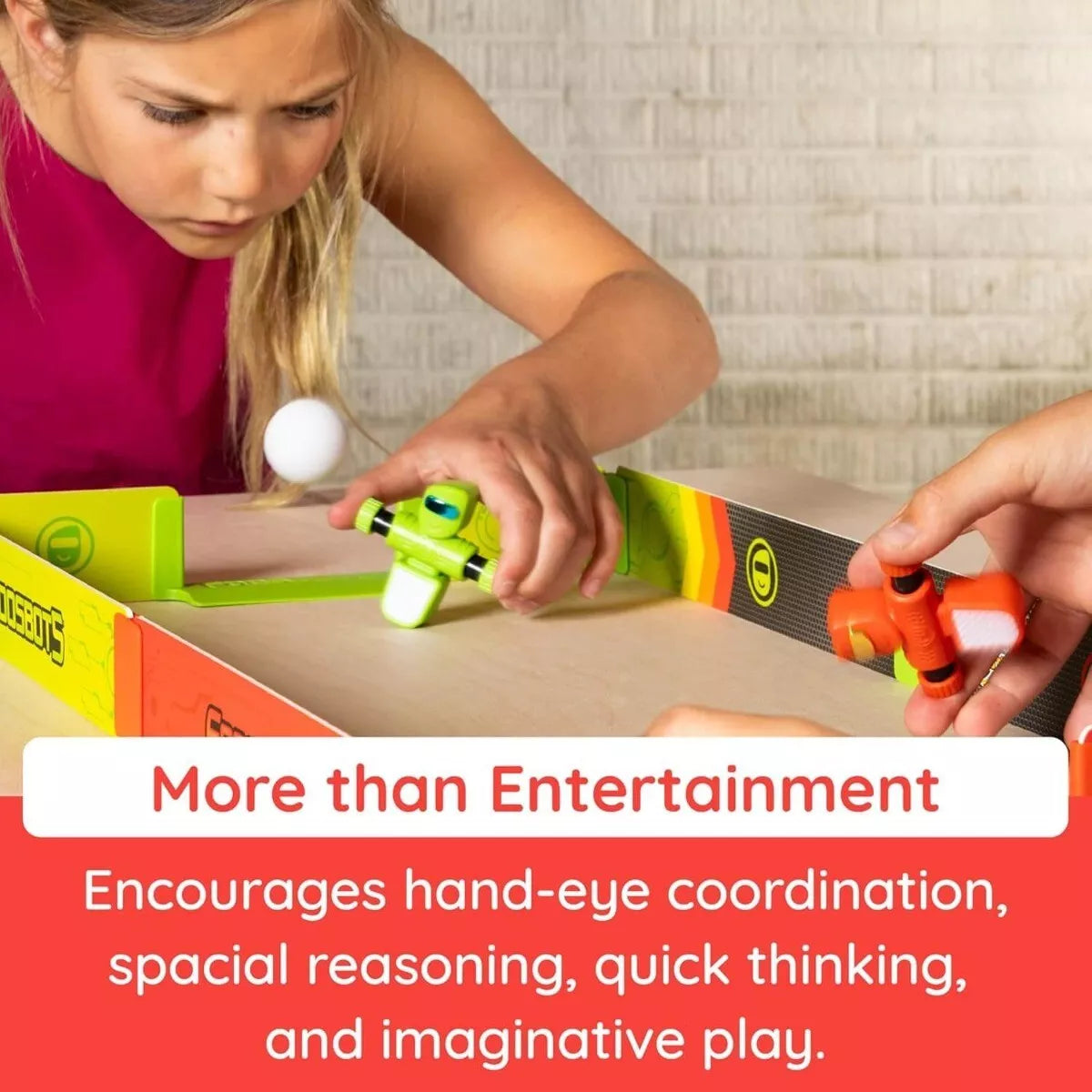 Pasiruošę žaisti?! Paruoškite stadioną ir pakvieskite žaidėjus. Suspauskite stalo futbolininko rankas, kad jis greitai suktųsi ir spirtų kamuolį. Ar pavyks pramušti priešininko gynybą ir įmušti pergalingą įvartį?