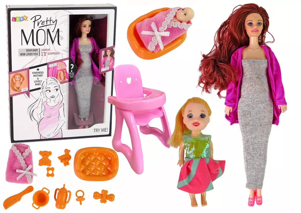 Nėščiosios lėlės rinkinys, puikiai tinkantis mažiesiems globėjams ir kūrybingų pramogų gerbėjams! Lėlė turi rudus plaukus ir mėlynas akis, vilki pilką aptemptą suknelę, rožinį megztinį ir avi elegantiškus rožinius aukštakulnius.