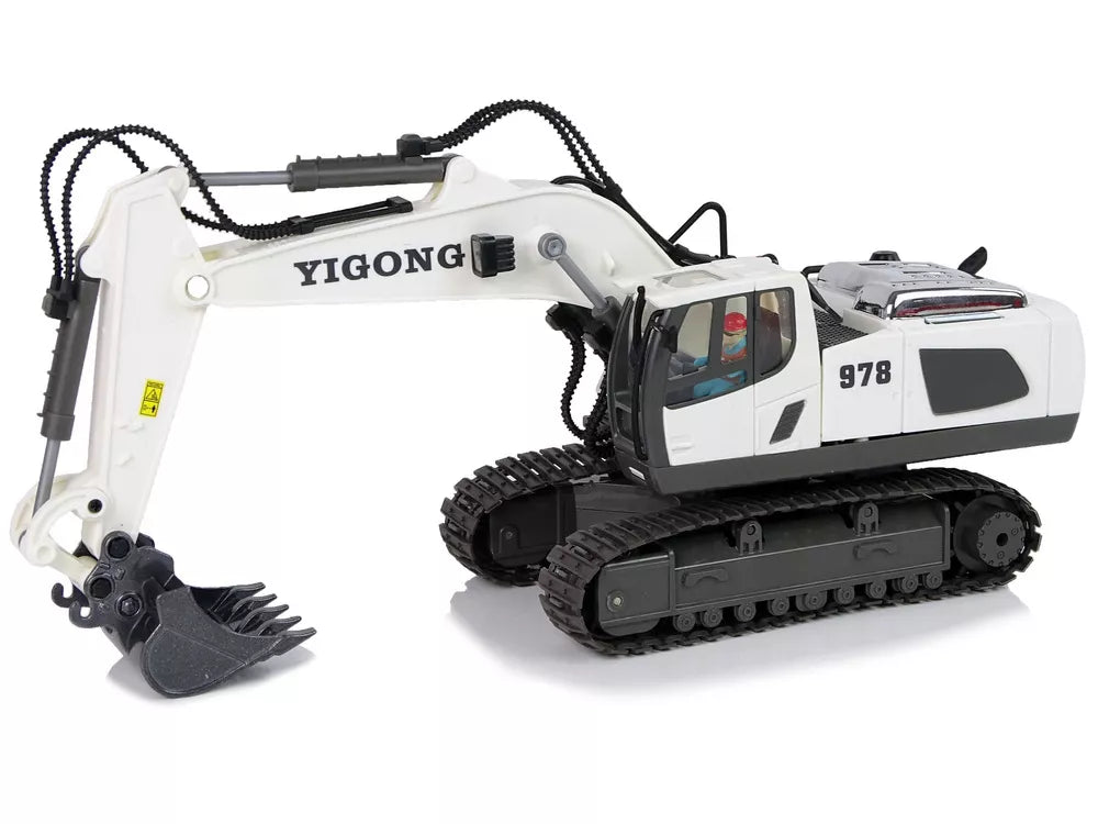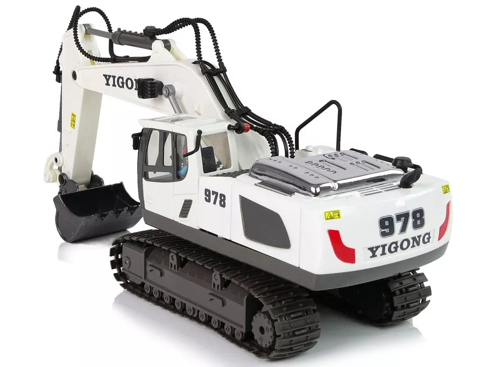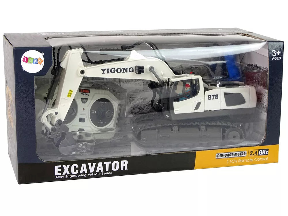 Nuotoliniu būdu valdoma statybinė transporto priemonė yra realistiškai atkurtas modelis. Baltą ekskavatorių puošia juodos spalvos detalės, taip pat išskirtiniai lipdukai. Nuotolinio valdymo pulto dažnis yra 2,4 Ghz. R/C nuotolinio valdymo pultelio valdymas labai paprastas, dvi vairalazdės leis patogiai manevruoti. Jo pagalba ekskavatoriaus operatorius gali valdyti ekskavatorių, keisdamas kryptis pirmyn / atgal ir į dešinę / kairę, reguliuoti garsą ir, svarbiausia, judinti kaušą. Kaušo šone sumontuota lemputė, kurią sukant apšviečiamas plotas.