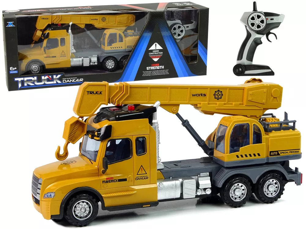 Nuotoliniu būdu valdomas sunkvežimis yra realistiškai atkurtas modelis. Geltoną sunkvežimį su kranu puošia juodos spalvos detalės, taip pat išskirtiniai lipdukai. Nuotolinio valdymo pulto dažnis - 2,4 Ghz. R/C nuotolinio valdymo pulto valdymas yra labai paprastas, o nuotolinio valdymo pultas patogiai telpa rankoje. Jo pagalba sunkvežimio operatorius gali valdyti sunkvežimį, keisdamas kryptis pirmyn / atgal ir į dešinę / į kairę.