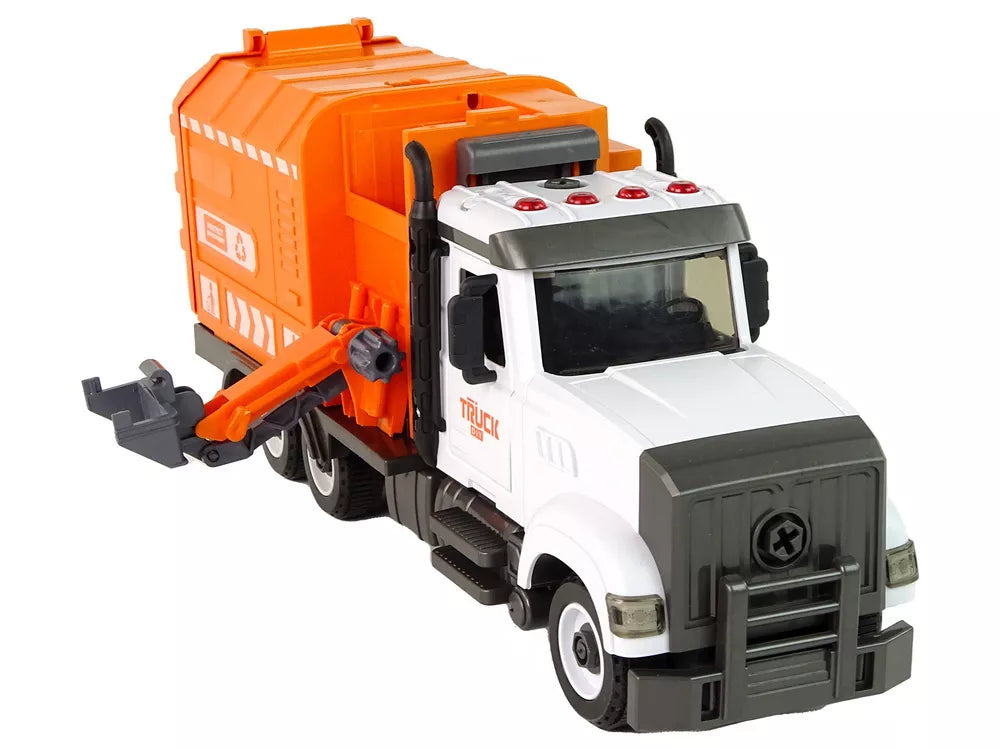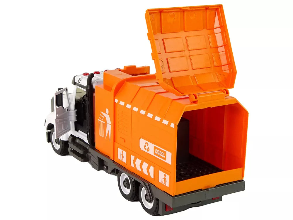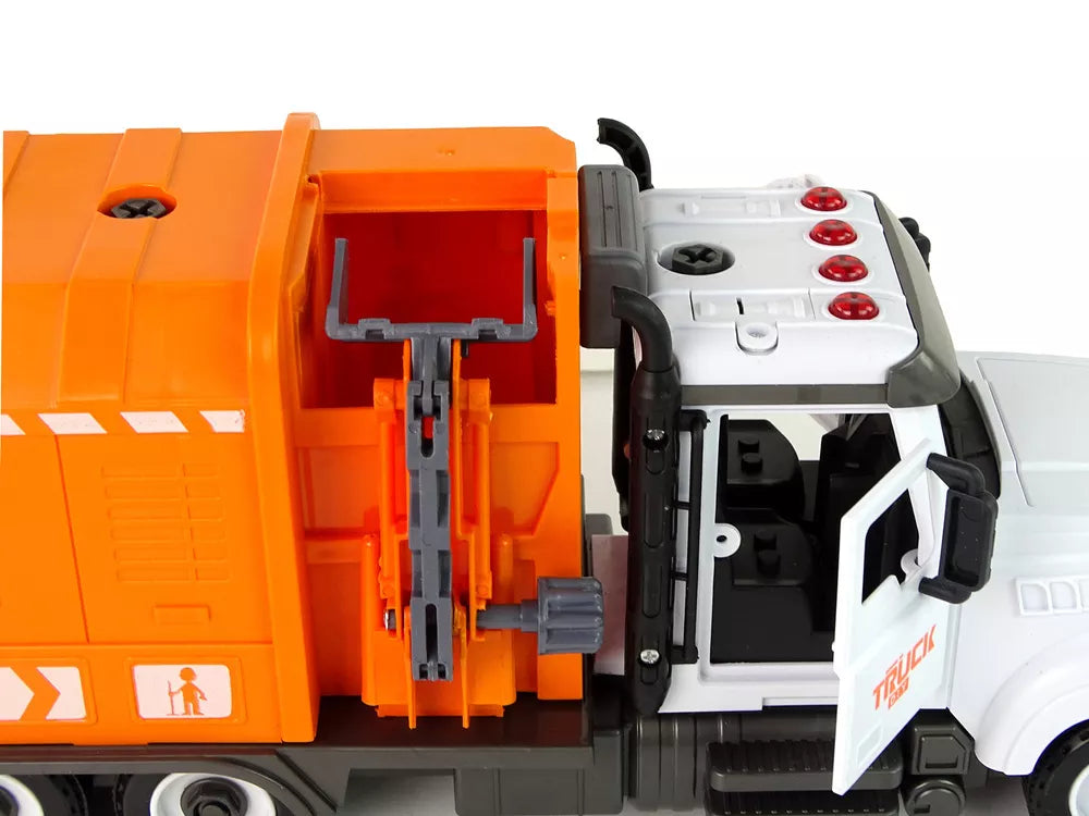 Pirmiausia į akis krinta įspūdinga ir tikroviška jo išvaizda. Jis turi didelius ratus, kurie užtikrina jo stabilumą. Atidaromos priekinės ir galinės durys suteikia autentiškumo ir leidžia vaikams tyrinėti transporto priemonės vidų bei imituoti šiukšlių rinkimo procesą. Šiukšliadėžės keltuvas yra kilnojamas, o tai dar labiau padidina pramogą.