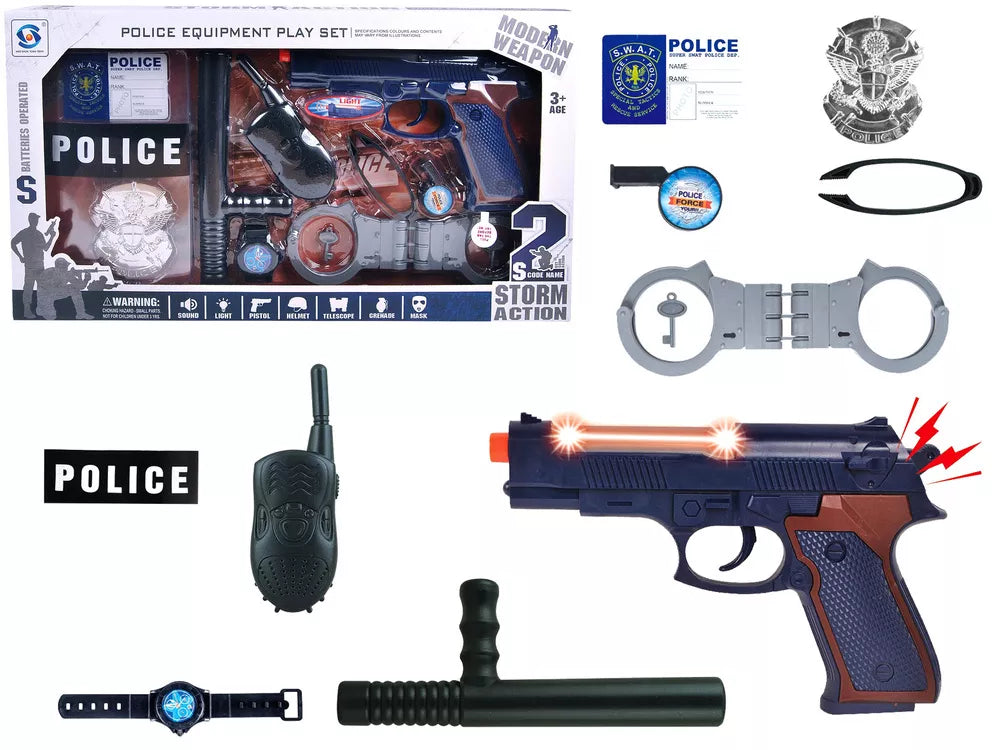 Rinkinį sudaro pistoletas su šviesos ir garso efektais, kuris padidina realistiškumą žaidimo metu, taip pat platus policijos aksesuarų pasirinkimas, tokių kaip badge, radijo ryšys, lazda ar apsauginis skydas, leidžiantis kurti savo intervencijų scenarijus. Dėl aukštos kokybės, pagamintos iš tvirto plastiko, visi elementai yra atsparūs intensyviam žaidimui ir užtikrins ilgas valandas pramogų.