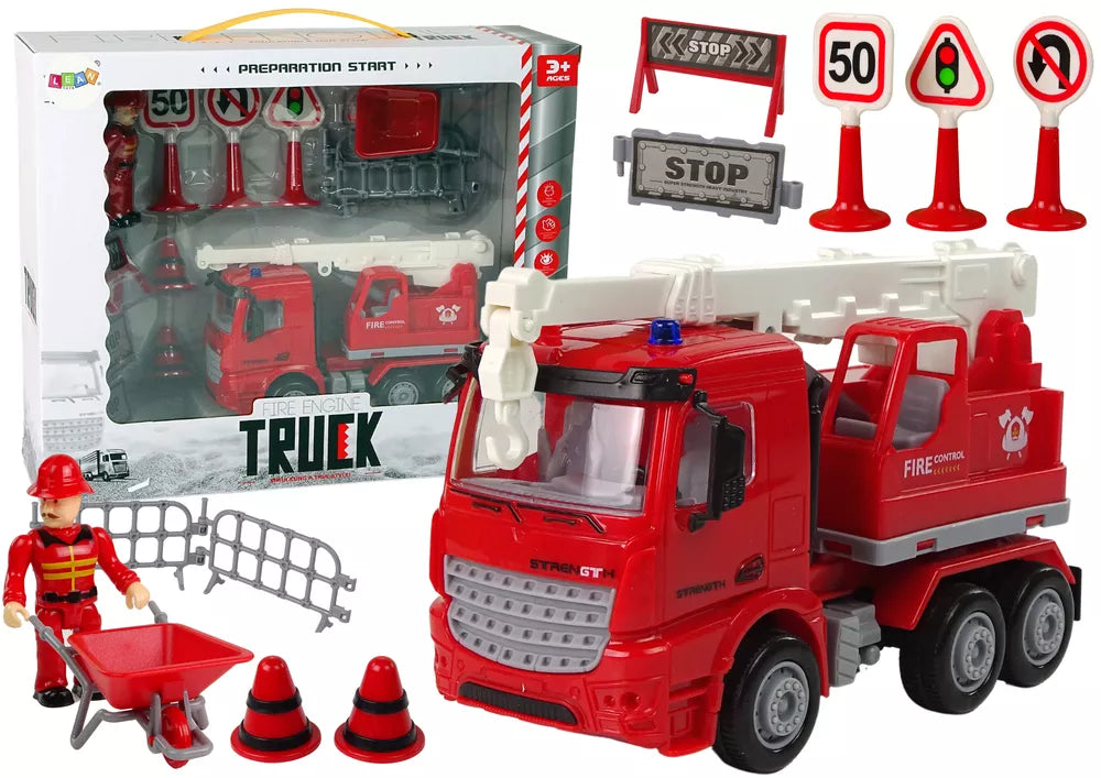 Priešgaisrinės tarnybos rinkinys su kranu ir kelio ženklais