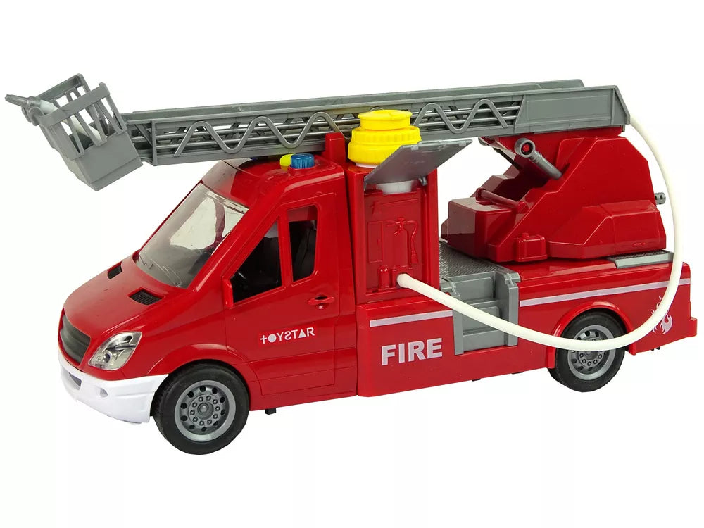 Automobilio kabinos viršuje yra geltona skylutė, pro kurią į vidų galima lengvai įpilti vandens. Keletą kartų ją paspaudę pamatysite, kaip iš nurodytoje vietoje sumontuotos žarnos išteka vanduo. Jūsų mažasis pagalbininkas pasiruošęs veikti! Paspauskite mygtuką, esantį konteinerio viršuje, ir stebėkite, kaip vanduo pradeda trykšti! Juo galima užgesinti nedidelius gaisrus. Kopėčios pakeliamos alkūnine rankena.