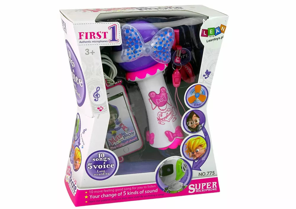 Rožinis ir violetinis mikrofonas buvo sukurtas galvojant apie mažiausius vaikus. Jis papuoštas baltomis detalėmis, suteikiančiomis jam įspūdingą išvaizdą. Žaislo apačioje esantys lankelis ir rutulys šviečia pasirodymo metu, taip dar labiau padidindami linksmybes. Šis daugiafunkcis žaislas skatina vaiko vystymąsi keliais lygmenimis – jis gerina klausą, muzikinius ir ritminius gebėjimus, taip pat lavina vaizduotę, susikaupimą ir motorinę koordinaciją.
