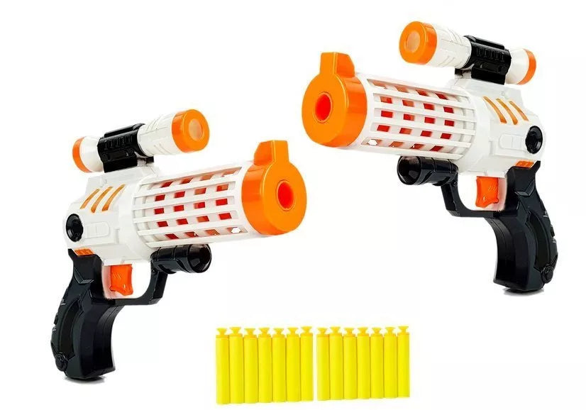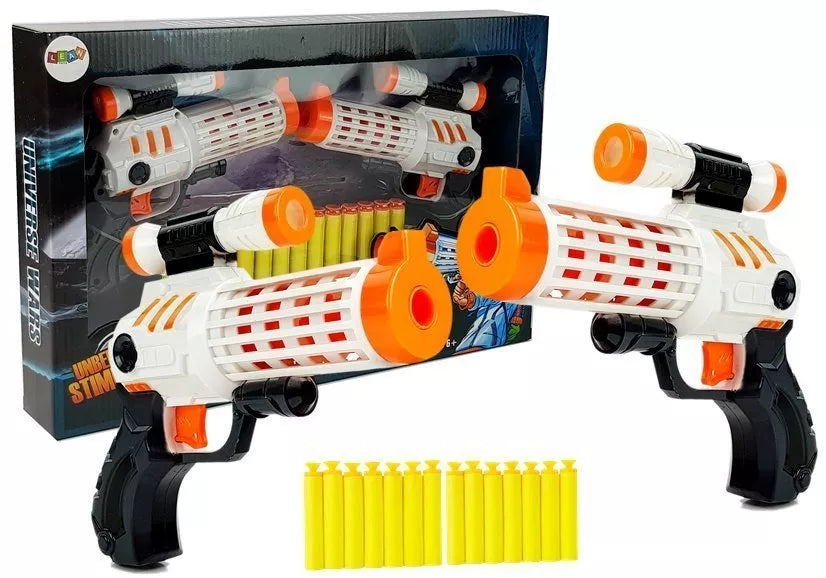 Šautuvas yra vienas iš geriausių dalykų, kurie yra kiekvienoje mažų berniukų kolekcijoje. Jis leis surengti daugybę žaidimų, kokius tik leis vaizduotė. Kosminis pistoletas leis jums ginti visatą. Pristatome dviejų pistoletų rinkinį: dabar galite pakviesti draugą arba šeimos narį bendrai žaidime!