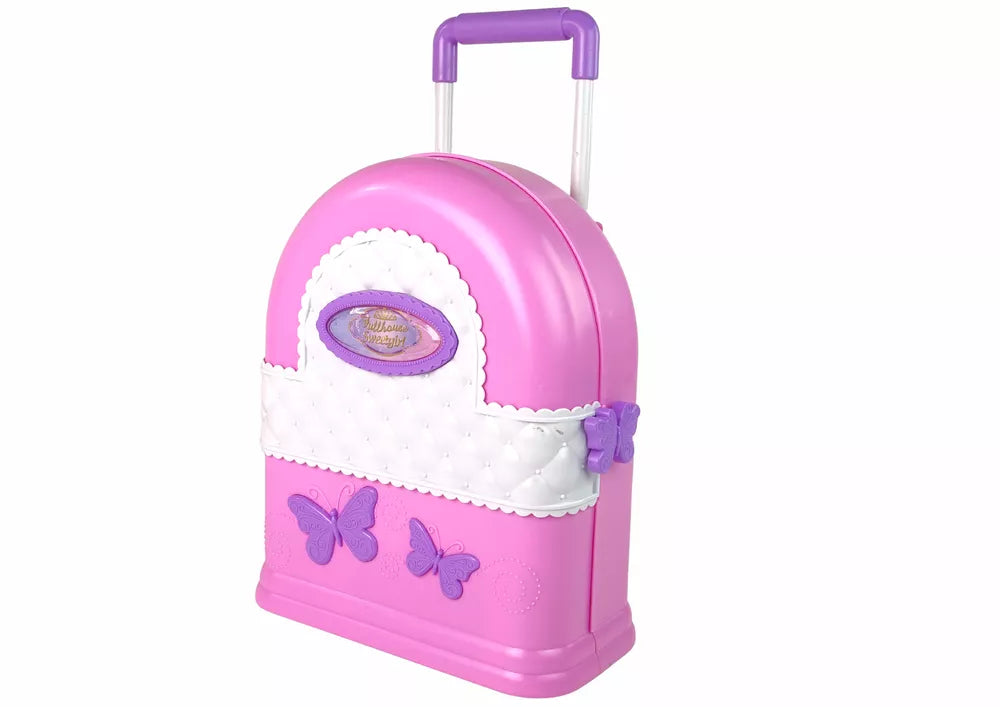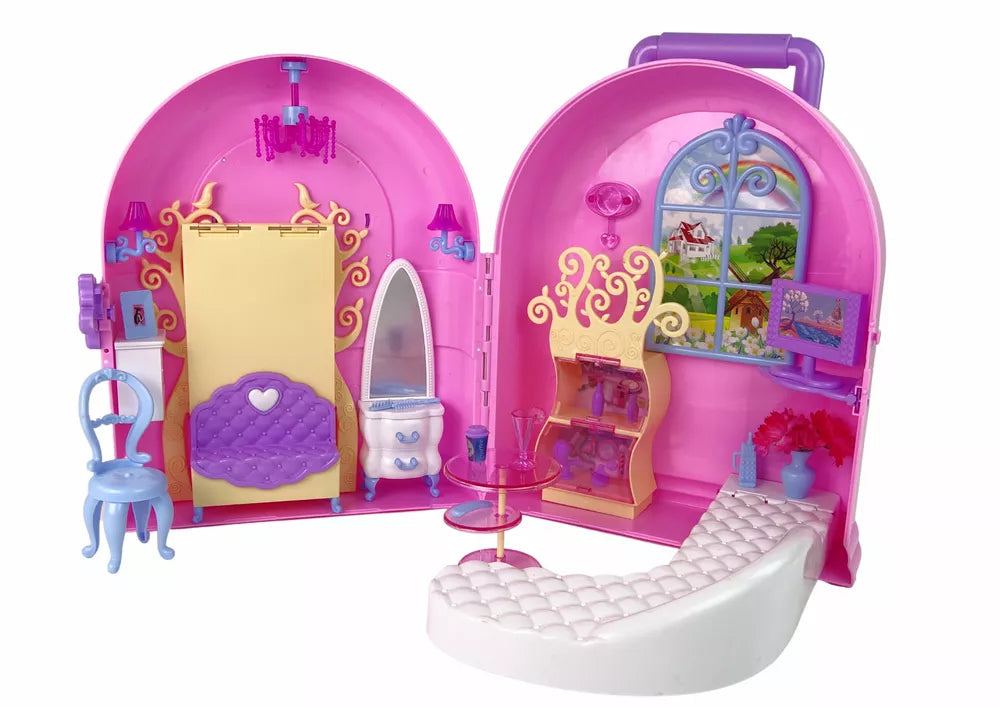 Sulankstytas namas labai primena mergaitišką, pastelinių spalvų lagaminėlį su ilga rankena. Šviesūs rožiniai-violetiniai atspalviai dera su baltais elementais, kas tikrai patiks kiekvienai mergaitei. Lagaminėlio viduje slepiasi pilnas elementų rinkinys, reikalingas žaisti su lėle.