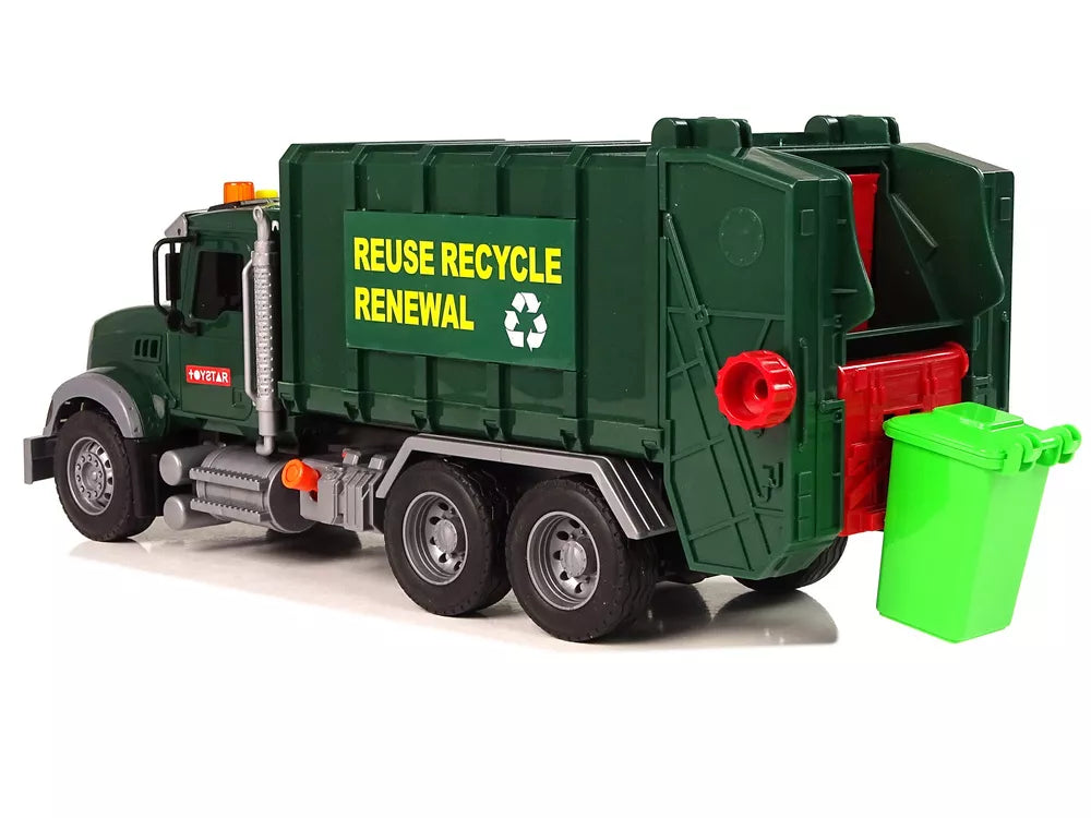 Papildomos funkcijos, tokios kaip garso ir šviesos efektai, suteikia efekto ir tikroviškumo visoms linksmybėms. Viršuje esantys įspėjamieji signalai signalizuoja apie judėjimą, viršuje esantis mygtukas yra atsakingas už garsus - garsinį signalą, kaušo pakrovimą, važiavimą atbuline eiga. Tamsiai žalios ir pilkos spalvų derinys leis automobiliui būti matomam iš tolo. Šiukšliavežė turi trinties pavara varomą galinę ašį stumti, tiesiog paspauskite galinę ašį, paleiskite į priekį ir mėgaukitės greičiu.