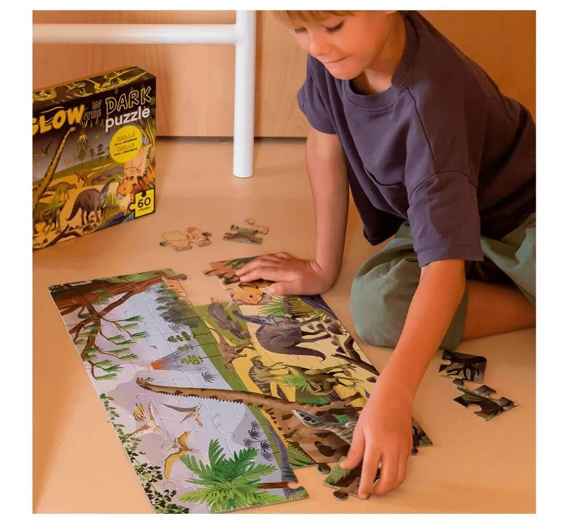 Leisk vaikui nerti į paslaptingą dinozaurų pasaulį su šia ypatinga tamsoje šviečiančia dėlione! Surink dėlionę iš 60 tvirtų detalių ir, kai paveikslas bus baigtas, išjunk šviesą – atgis švytintys dinozaurai ir paslaptingos detalės, kurios matomos tik tamsoje!