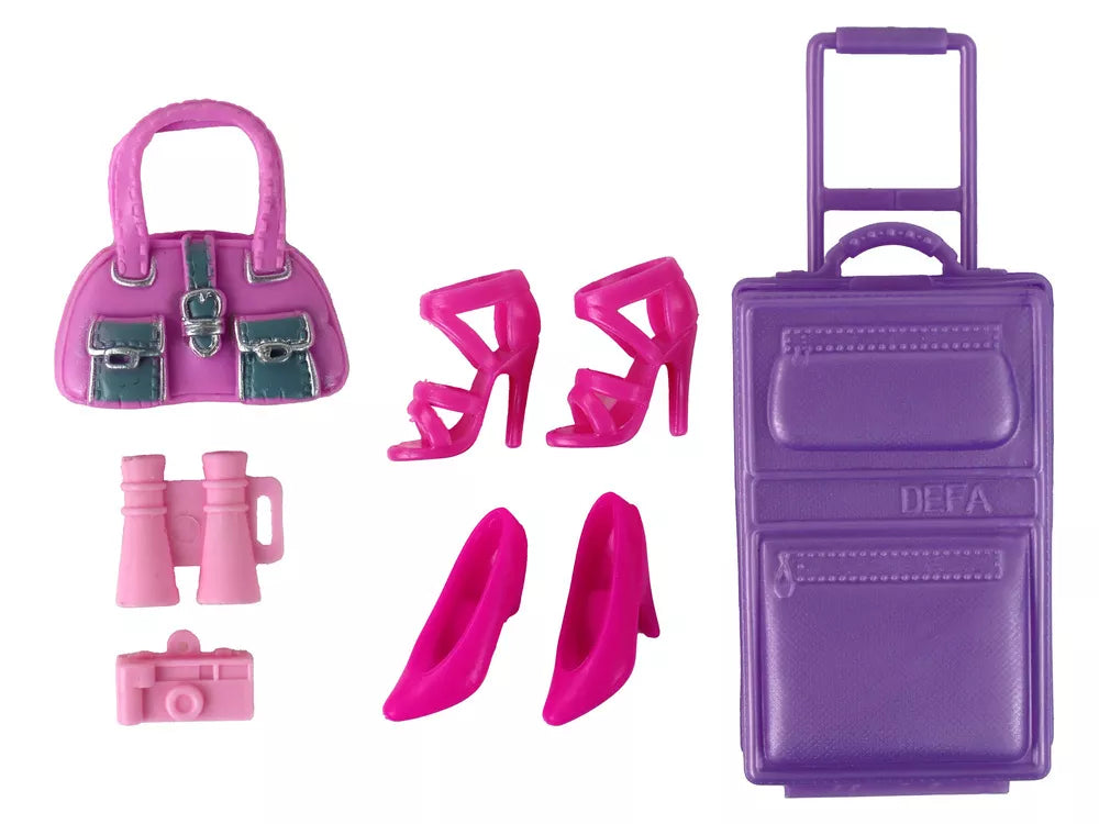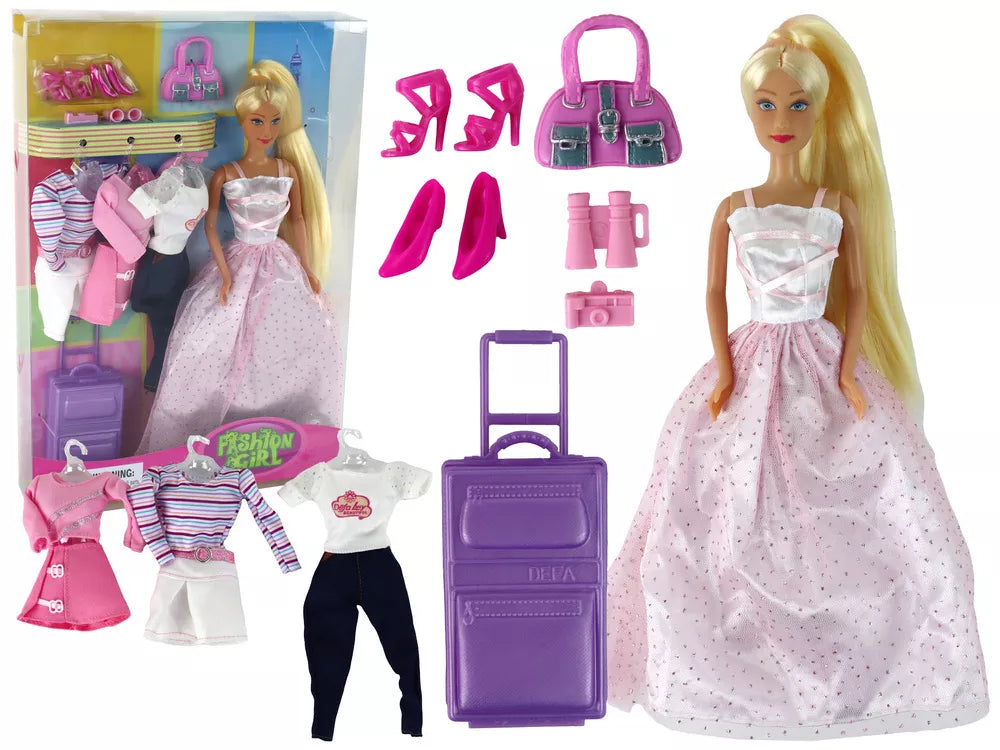 Štai puiki lėlė, ideali kūrybingiems kelionių žaidimams. Jos ilgi, šviesūs plaukai gali būti šukuojami ir eksperimentuojama su įvairiomis šukuosenomis, kas skatina vaikų kūrybiškumą. Lėlė yra aprengta elegantiška suknele puošta tiuliu ir blizgučiais, o jos mėlynai akys suteikia žavesio. Rinkinyje taip pat yra dvi poros rožinių aukštakulnių batų, violetinis atidaromas lagaminas (8 cm x 5 cm x 3 cm) su ištraukiama rankenėle, rožinė rankinė, fotoaparatas ir žiūronai, kas leidžia įgyvendinti įvairiausius nuotykius ir vaidmenis. Papildomai, rinkinys apima tris skirtingus drabužių komplektus, tarp jų – sijoną su blizgančiu diržu ir ilgomis rankovėmis dryžuotomis palaidinėmis, rožinį sijoną su rožine palaidine ir tamsias kelnės su balta palaidine su ažūrine, trumpa rankove, puošta blizgučiais.
