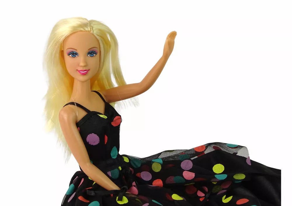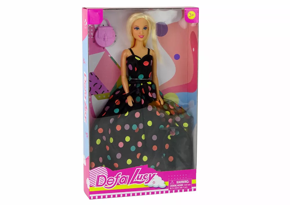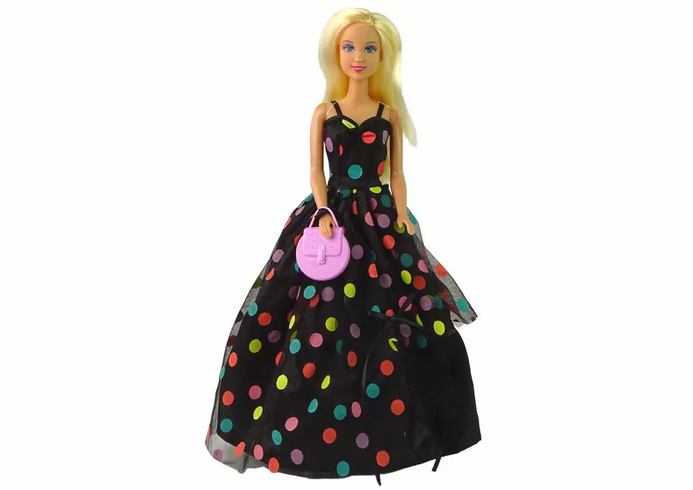 Lėlė apsirengusi ilga suknele, kuri yra juodos spalvos su spalvotais taškais. Šie taškai suteikia suknelei džiaugsmingą ir smagų charakterį. Suknelė yra laisva ir laisvai krenta, suteikdama lėlei elegantišką išvaizdą.