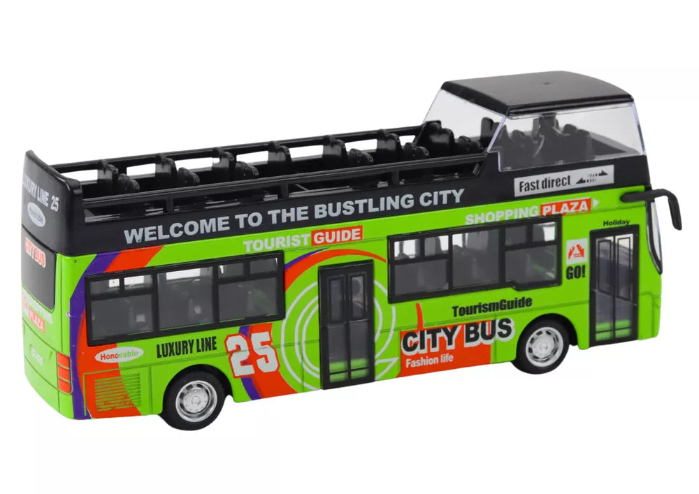 Žalias dviaukštis autobusas su atidaromis durimis