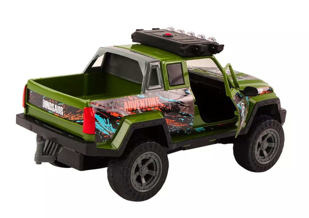 Visureigis medžioklinis automobilis yra puikus žaislas jauniesiems nuotykių ieškotojams ir dinozaurų entuziastams. Automobilis yra stilingos žalios spalvos, su tikroviškais medžioklės ženklais ir iš karto patraukia dėmesį savo autentiška išvaizda. Ant automobilio stogo yra funkcinė lemputė, kuri pradeda šviesti paspaudus mygtuką, o automobilis skleidžia tikroviškus variklio garsus, suteikiančius pramogai papildomo tikroviškumo.