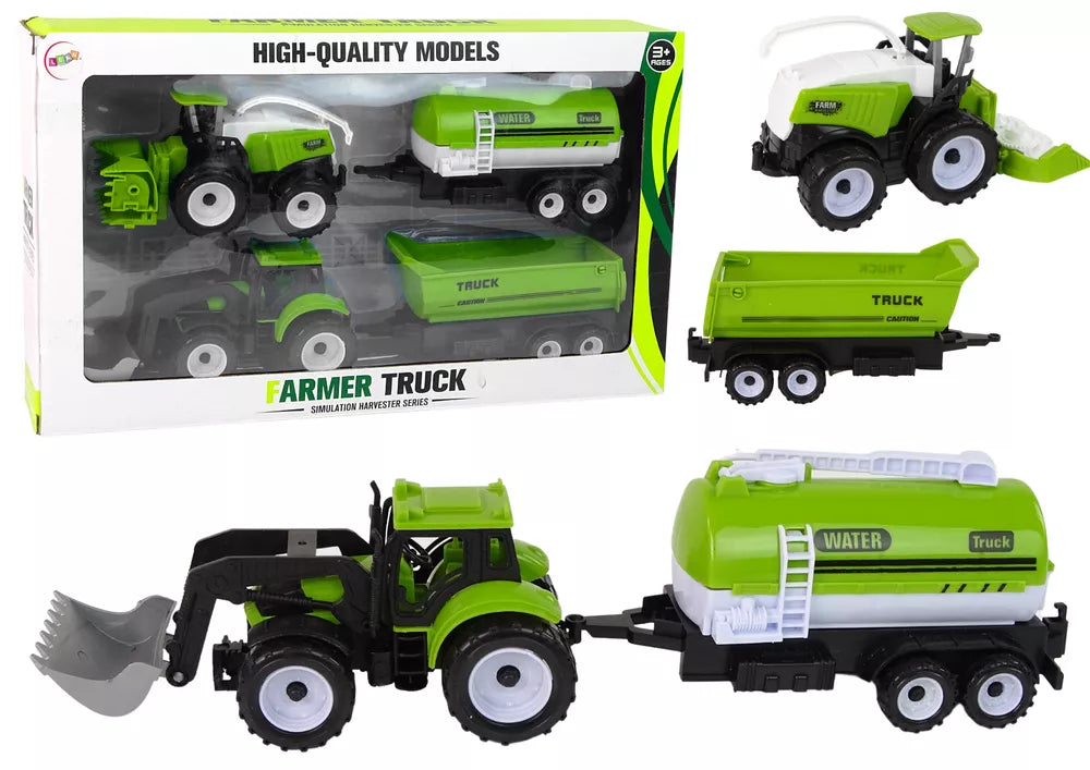 Rinkinį sudaro traktorius, kombainas ir dvi skirtingų funkcijų priekabos - cisterna vandeniui vežti ir puspriekabė grūdams vežti. Transporto priemonėse yra judančių elementų, kurie dar labiau pabrėžia jų tikroviškumą ir leidžia vaikui geriau suprasti žemės ūkio mašinų veikimą. Tai ne tik puiki pramoga, bet ir galimybė daugiau sužinoti apie tai, kaip veikia žemės ūkis. Kiekvienas rinkinys siūlo skirtingas žaidimo galimybes ir leidžia atlikti įvairius vaidmeninius žaidimus, susijusius su darbu ūkyje.