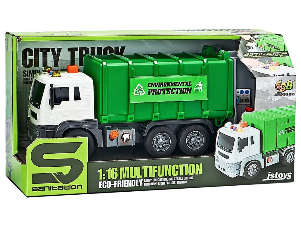 Šiukšliavežė yra puikiai sumodeliuota, akį traukiančios žalios spalvos. Rinkinyje taip pat yra plastikiniai konteineriai smulkiems daiktams išmesti. Transporto priemonė turi trinties varomą galinę ašį; tiesiog paspauskite galinę ašį, atleiskite ją ir mėgaukitės greičiu. Atidaroma priekaba leidžia išpilti šiukšles tinkamoje vietoje. Norėdami pakrauti jas į sunkvežimį, tiesiog užkabinkite konteinerį ant kopėčių ir patraukite rankeną, kad pakeltumėte konteinerį ir ištuštintumėte turinį į konteinerį. Norėdami ištuštinti turinį naudodami siurblį, galima pakelti visą konteinerį.